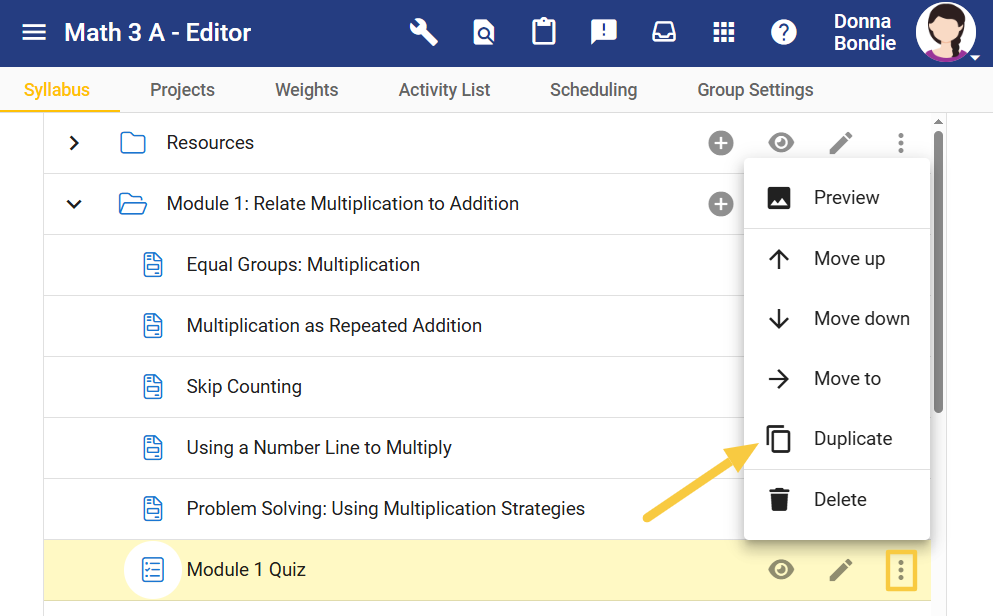 The duplicated assessment appears at the bottom of the module. Drag and drop it just below the original.