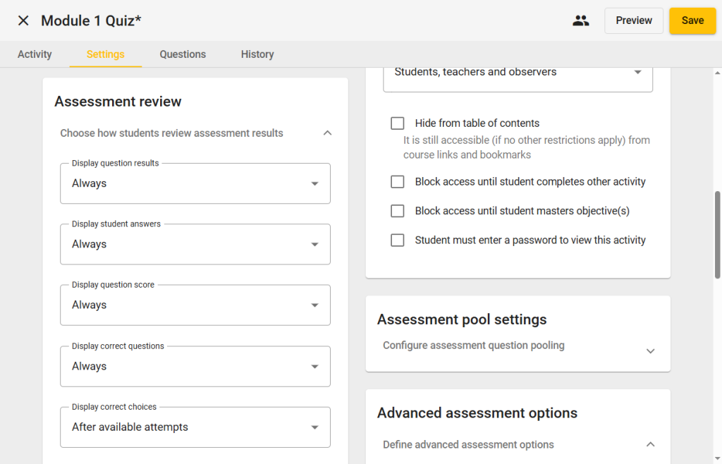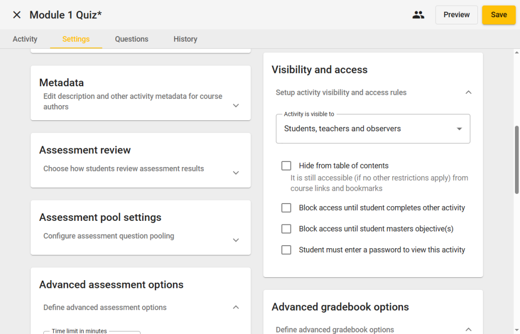 Note: Adding an assessment password here is optional if already added in the Visibility section.