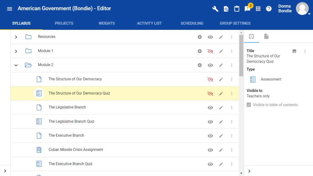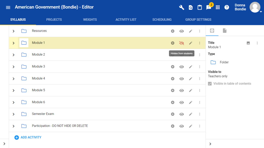 From the Syllabus tab, locate the module you wish to hide. Select the eye icon next to the module name to hide it from students.