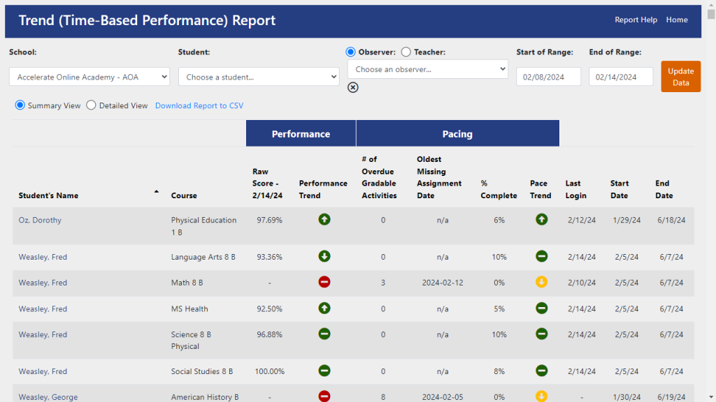 The Trend Report is most effective when used regularly (weekly or biweekly) to monitor students working to get back on pace.
