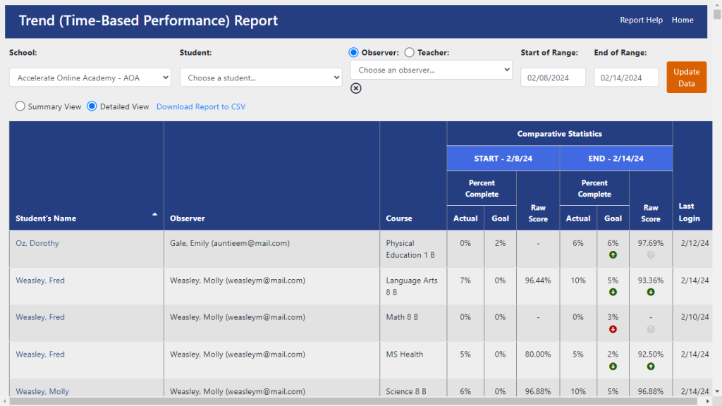 The Detailed View shows how student performance and pacing have changed between the selected start and end dates.